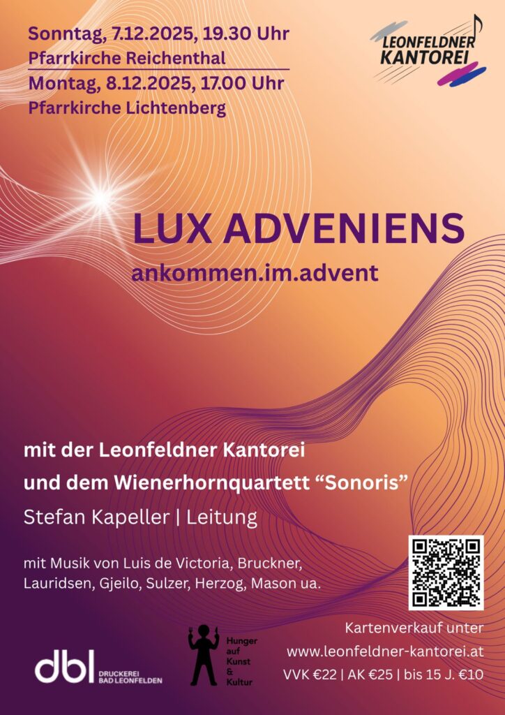 Die Leonfeldner Kantorei und das Wienerhornquartett „Sonoris“ widmen sich mit diesem Programm dem Motiv des Lichtes – einem Sinnbild, das in der Adventszeit seine tiefste Bedeutung entfaltet. Dieses Licht kennen wir nicht nur aus den Geschichten von Bethlehem, es vermittelt auch heute noch Zuversicht, die wir inmitten einer unruhigen Welt brauchen – in Zeiten, in denen politische und gesellschaftliche Schatten über unsere Welt fallen und das Vertrauen auf die Zukunft auf die Probe gestellt ist.